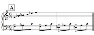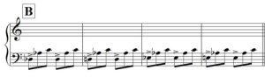 Huomaa, että A-osan vasemman käden arpeggiokuviossa vain kaksi alinta säveltä muuttuu.